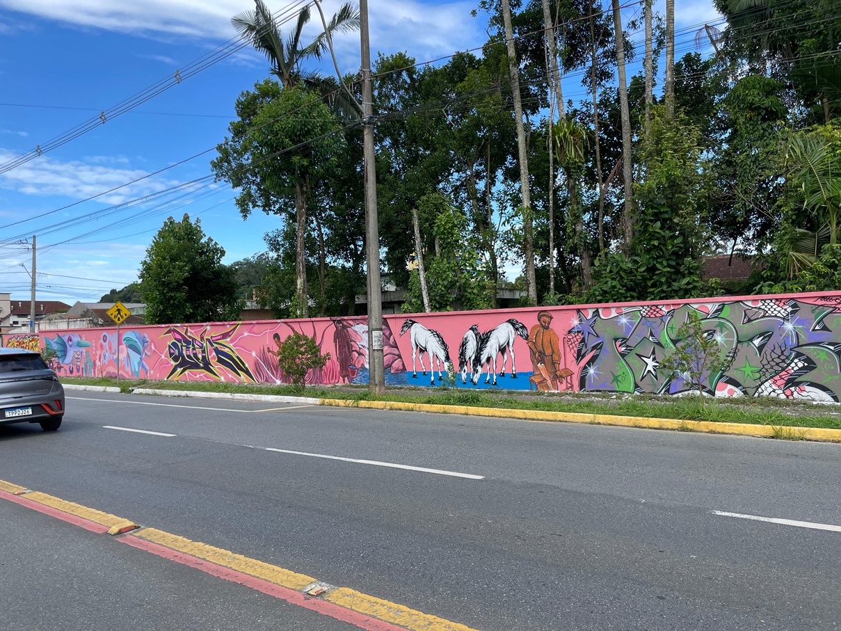 Um grupo de artistas visuais, já conhecidos em Joinville e região, alguns até nacionalmente, se uniram no último sábado e domingo, 11 e 12, para fazer uma intervenção artística, em muro localizado na rua Timbó, no bairro América em Joinville.